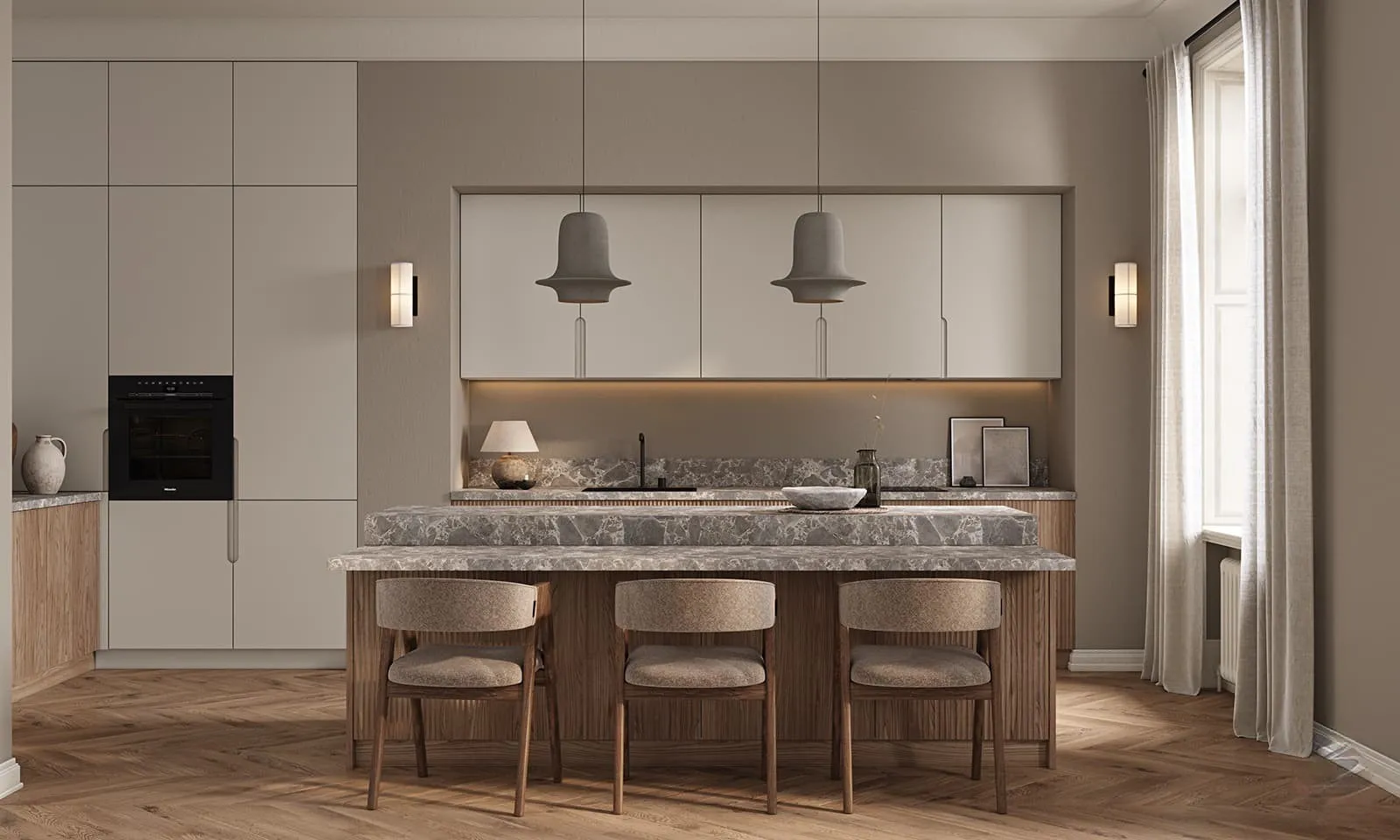 Фасады: T433 Шпон дуба, цвет #189 (воскобейц Белый); Т622 / T619 Крашеная МДФ, цвет NCS S 1002-Y Матовый.
